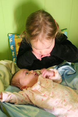 isa is lavishing in her new role as the big sister these days. she wants sylvi to do everything she does, including going to the babysitter. she always wants to hold sylvi and give her a pacifier. she is quite proud to share her blocks or her books and sometimes even her parents' attention. sylvi doesn't quite share this enthusiam yet and mostly looks at her with a worried look, but we are guessing she'll get on the little sister bandwagon soon!